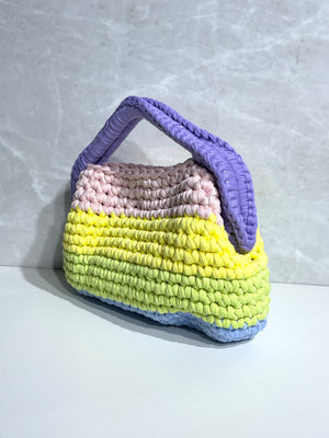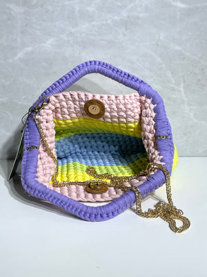 Mini borsa da portare a mano, ma con una catenella lunga per indossarla a tracolla, realizzata in crochet in vari colori vivaci.